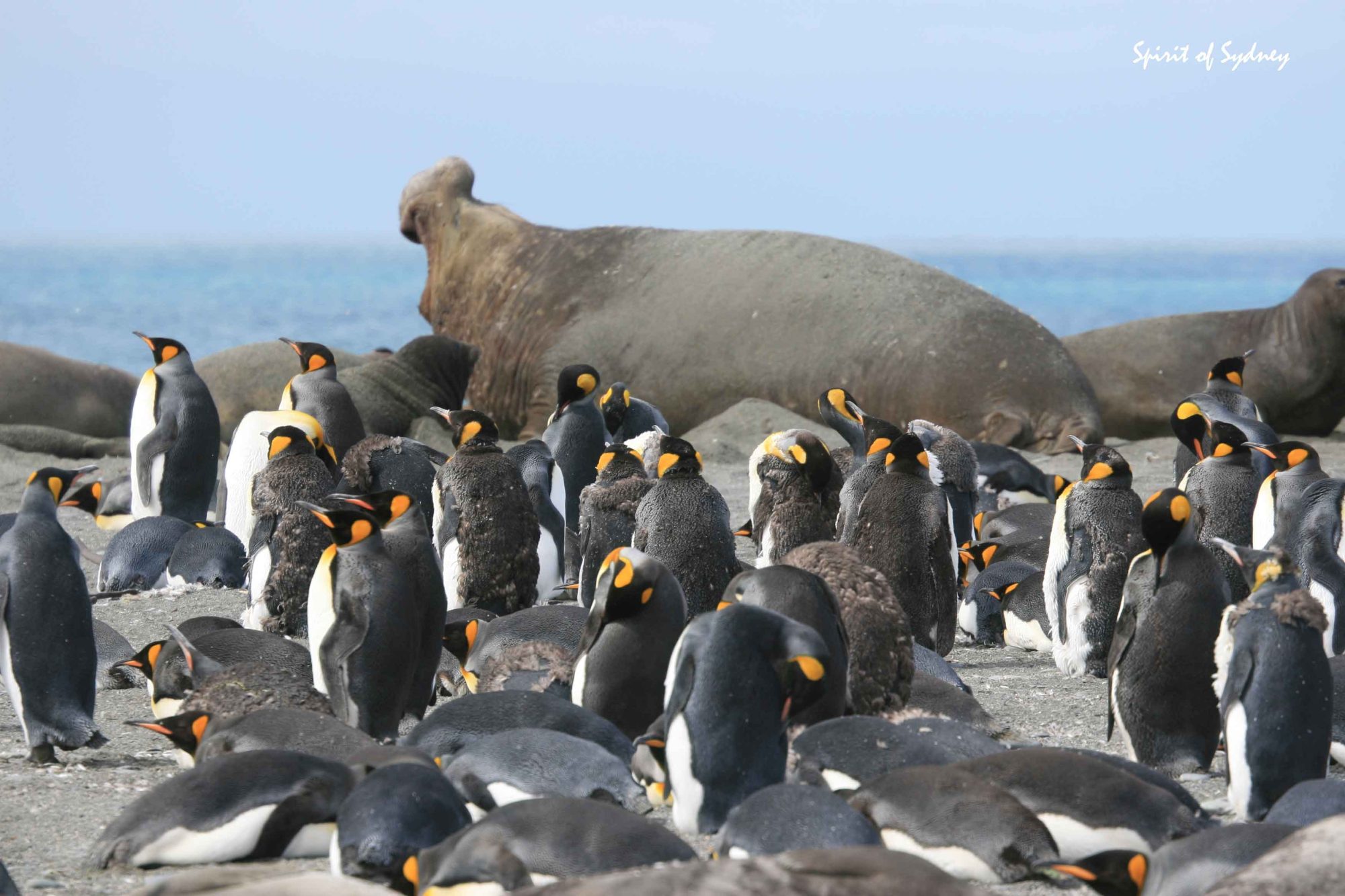 fluffy King Penguin chicks stand around in large groups. More elephant
